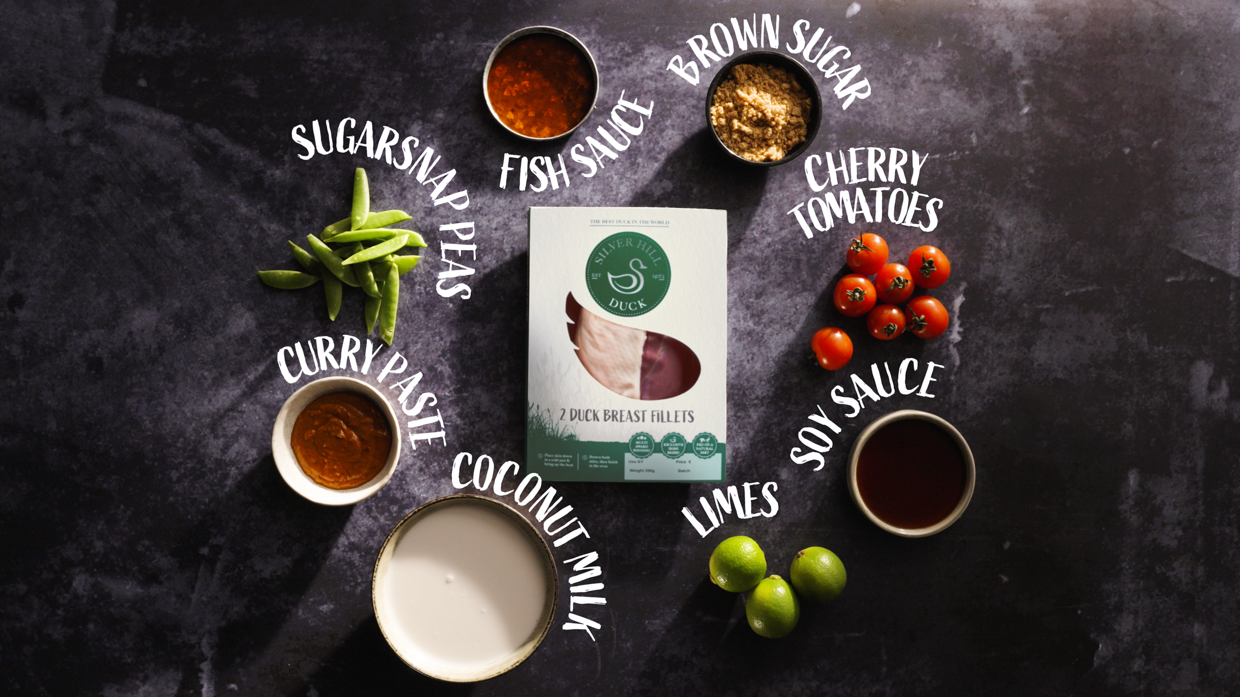 Add the curry paste to the fat in the pan and stir for 2-3 minutes until fragrant. Add the coconut milk and mix well. Add in the soy, fish sauce, lime zest and sugar. Simmer for 5 minutes until the sauce has reduced and thickened a little. Add the tomatoes, sugarsnap peas, lime juice and sliced duck breasts and simmer for 5 minutes.